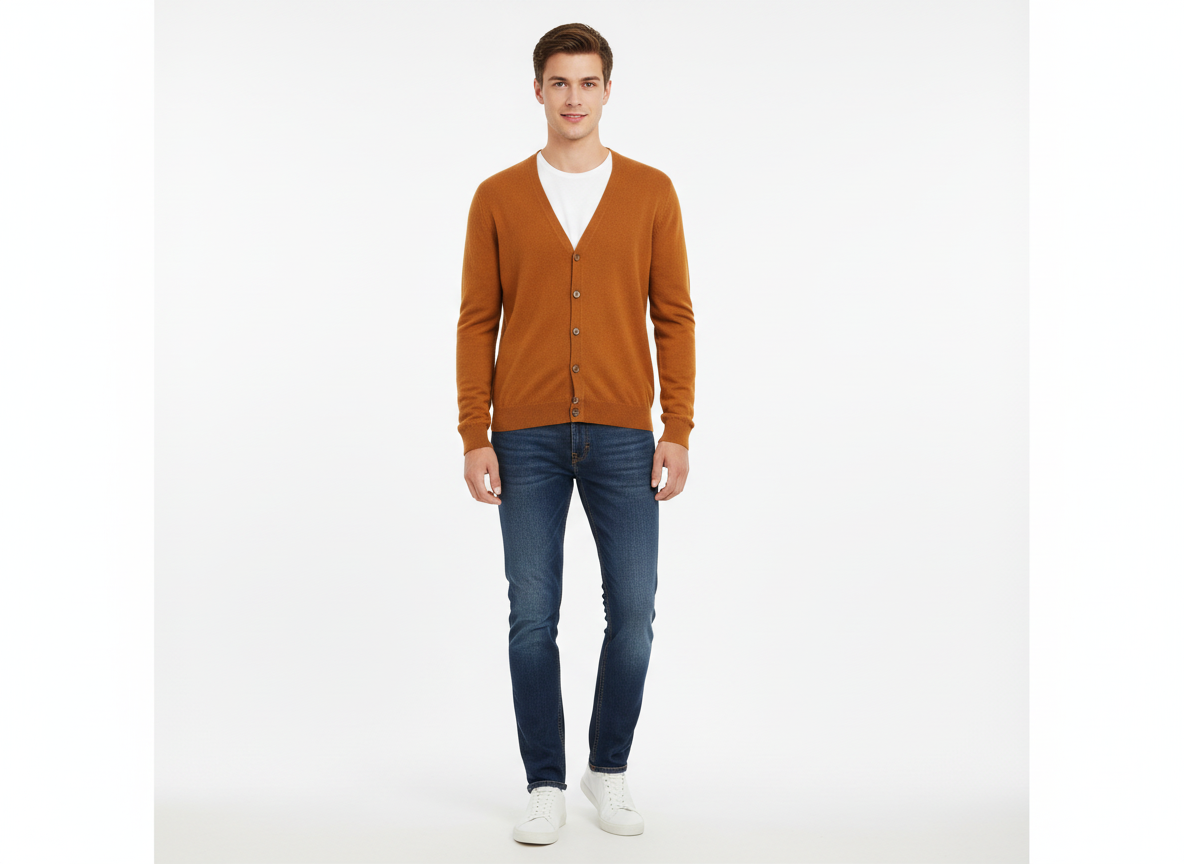 Cardigan uomo Gran Sasso in lana, e cashmere, colore mattone, filato invernale d'eccellenza con alte performance termiche, scolla a v, maniche lunghe, chiusura con bottoni effetto madreperla, bordi a costine, regular fit, made in Italy.