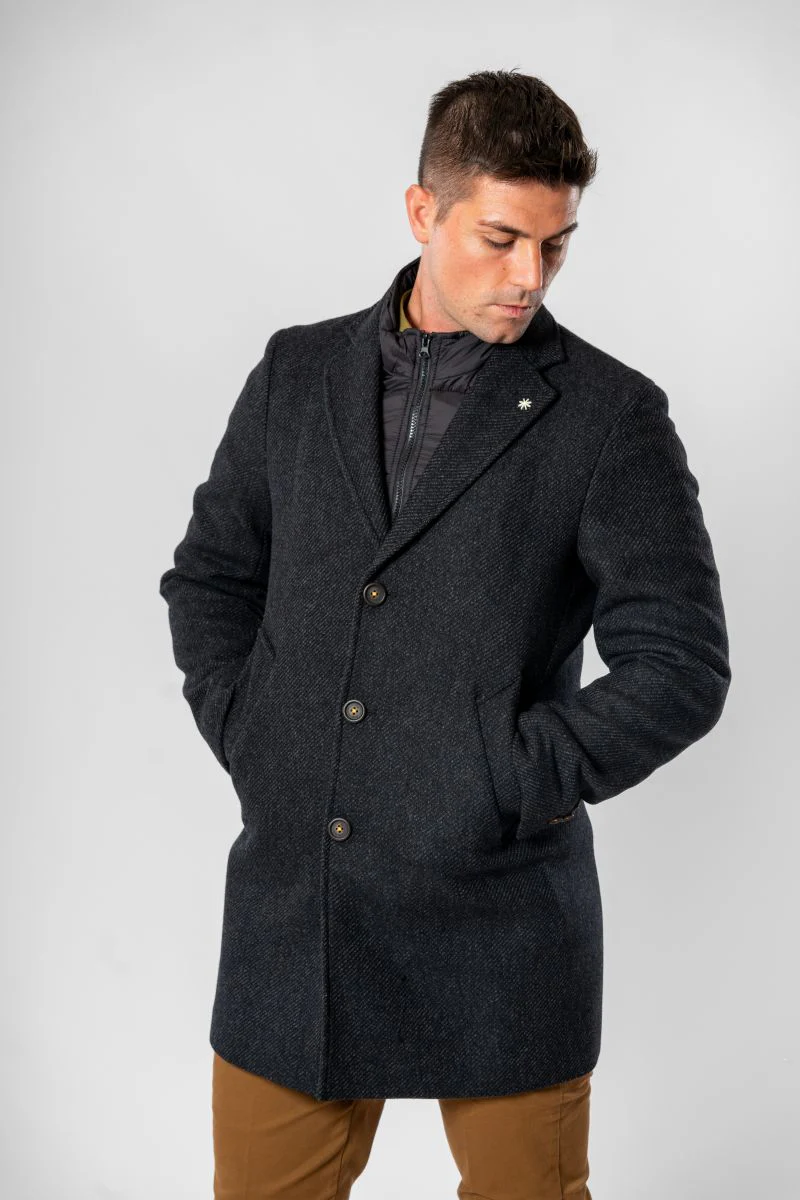 Cappotto in misto lana lavorata in diagonale dalla vestibilità regolare. Il capo presenta la pettorina staccabile, tasche esterne diagonali e tre bottoni. Tasche interne.